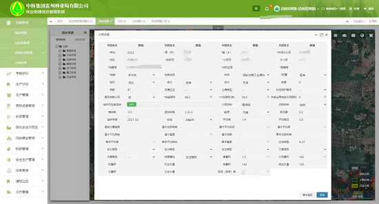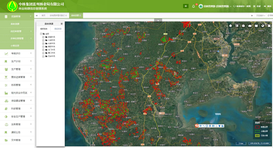 地理信息子系统业务功能包括电子地图、生产管理、资源管理、统计分析、考核评分等功能模块,系统通过“一张图”、“一张表”的数据库信息管理模式,可以实现对林木种苗生产、新造林、中幼林抚育、伐区调查设计、木材生产、木材销售、木材加工、科研林地管理、林地征占用、火情火灾、林政案件和林地灾害等林业生产全过程的统一集中和线上管理。