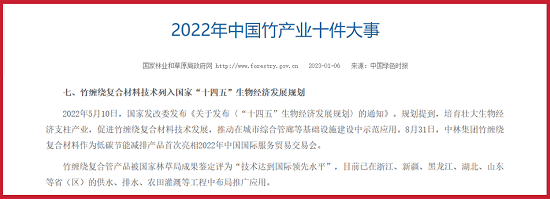 1月6日,中国竹产业协会发布“2022年中国竹产业十件大事”,“中林集团竹缠绕复合材料技术列入国家‘十四五’生物经济发展规划”位列其中。